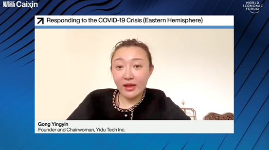 The World Economic Forum (WEF) Virtual Event of the Davos Agenda was held online. Gong Rujing, Founder and Chairlady of Yidu Tech, addressed in the leaders' seminar on "Responding to the COVID-19 Epidemic Crisis" that innovative technologies, such as artificial intelligence, have become the powerful weapon to fight against the epidemic. They play an important role in many aspects of epidemic research and simulation prediction.