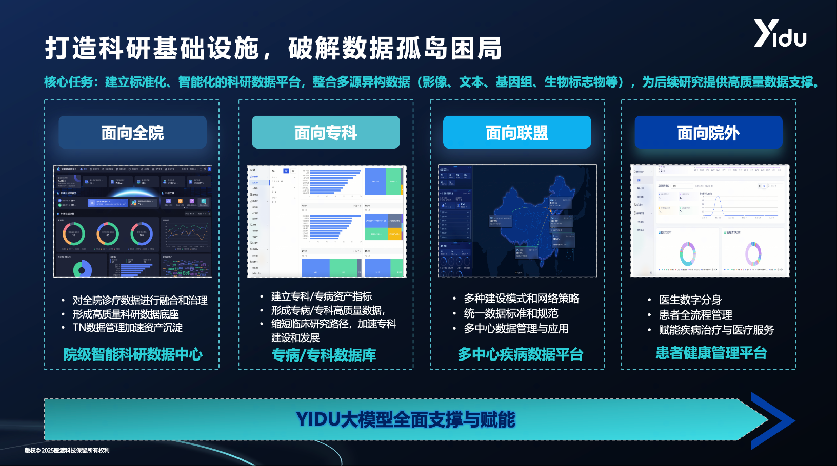 醫(yī)渡科技的科研創(chuàng)新不僅在于技術突破,更在于構建了覆蓋“全院-專科-聯(lián)盟-院外”的智能科研生態(tài)體系。該體系從全院級數(shù)據(jù)中心到專科定制研究路徑,從多中心協(xié)同到臨床轉化延伸,在保障數(shù)據(jù)規(guī)范與安全的同時,靈活滿足多元需求,大幅提升科研效率與質量。