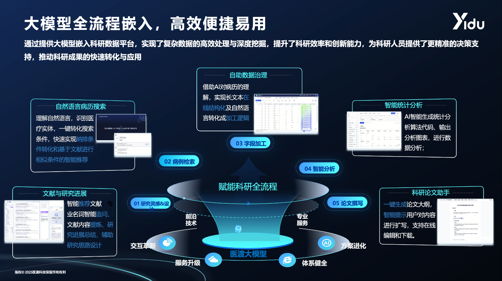 在科研大數(shù)據(jù)平臺能力升級中,醫(yī)渡科技自主研發(fā)的“醫(yī)渡大模型”已深度賦能科研全鏈條,推動科研全流程自動化,在自然語言檢索病例、智能數(shù)據(jù)加工、統(tǒng)計分析、論文撰寫等多個關鍵環(huán)節(jié)為研究者提供助力。